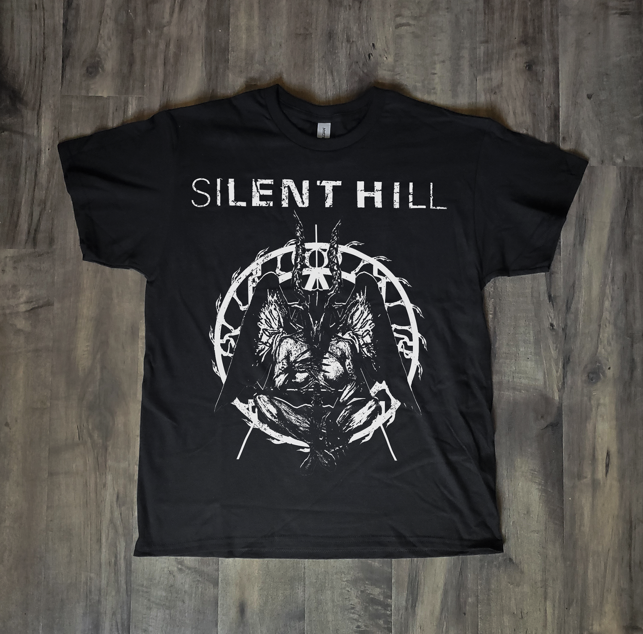 Professionally handmade screen print on a black tee.